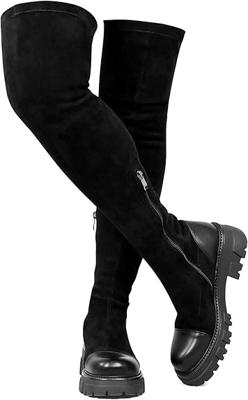 Over The Knee Boots Women Suede Black Thigh High Boots Patchwork Suede Boots Platform Lug Sole Boots Comfortable Stretch Boots