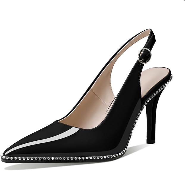Women Beaded Pumps High Heel Slingback Pointed Toe Slip On 3.5 Inch Stilettos Ankle Strap Adjustable Buckle Patent Leather US