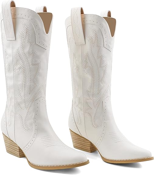 Women Mid-calf Cowboy Boots Pointy Toe Boots Embroidered Western Cowgirl Boots Chunky Heels
